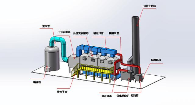 1.噴淋塔+干式過濾器預(yù)處理+活性炭吸脫附+催化燃燒;