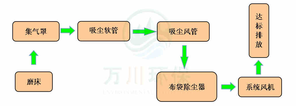 磨床生產(chǎn)時產(chǎn)生的粉塵通過集氣罩、吸塵軟管進(jìn)入到脈沖布袋除塵器中過濾凈化,粉塵落入灰斗,凈化后的廢氣通過系統(tǒng)風(fēng)機達(dá)標(biāo)排放。