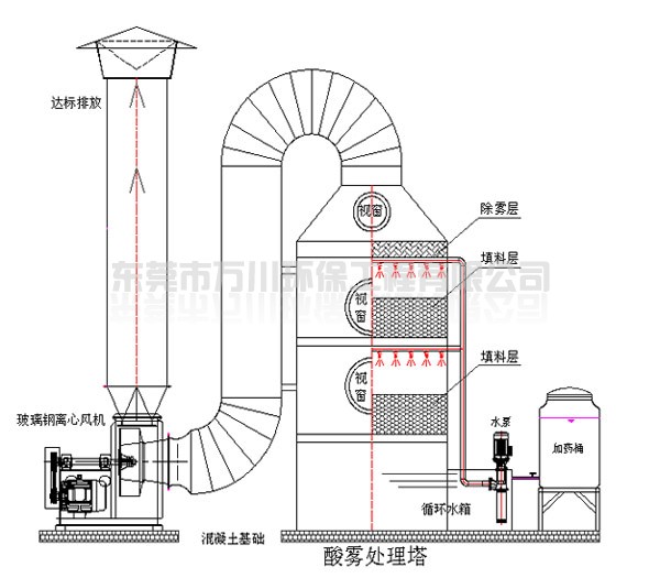 酸霧廢氣由風管進入酸霧處理塔,自下而上穿過填料層;循環(huán)堿液吸收劑由塔頂通過螺旋噴嘴,形成的水霧勻地噴淋到填料層中,沿著填料層表面向下流動,進入循環(huán)水箱。由于上升氣流和下降霧化吸收劑(堿液)在填料中不斷接觸,上升氣體中流質(zhì)的濃度越來越低。使其酸霧得到凈化,達標排放。
